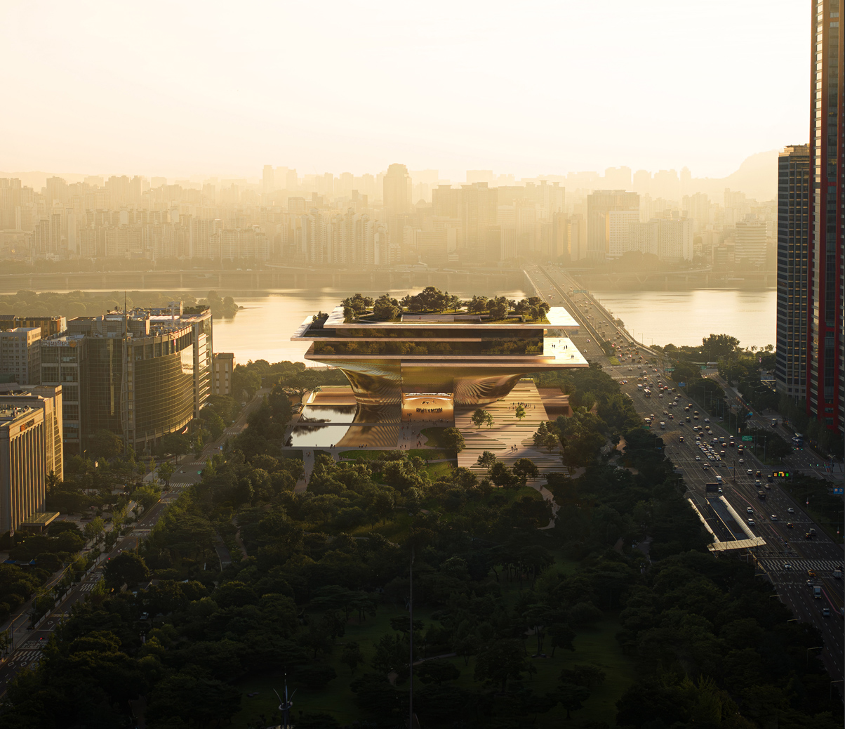 한강을 따라 대지의 평평한 켜가 그대로 떠 있는 새로운 시민의 장소를 만드는 것이다. 이것으로 수평적으로 이어지는 강의 풍경을 안고 들어와
