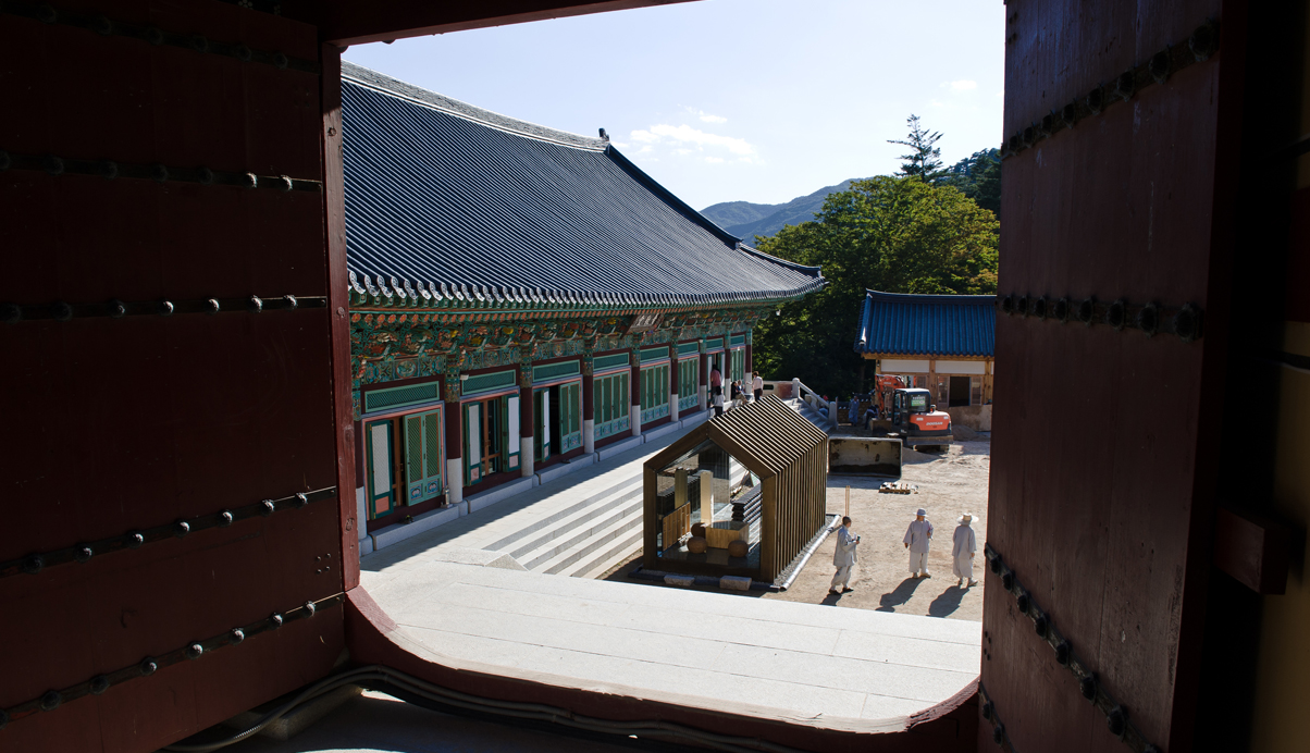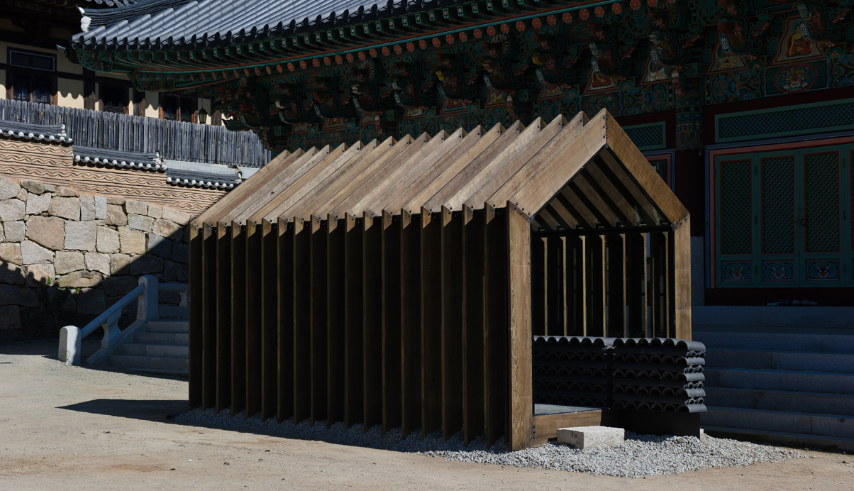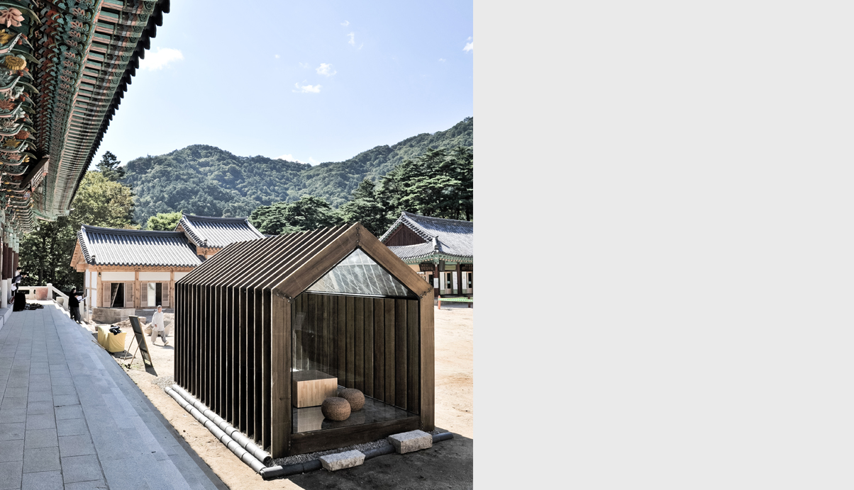 주된 디자인 의도는 자연에 자연스럽게 배치된 기존 해인사의 아름다운 경관을 해치지 않도록, 제 형태를 갖고 완성된 경계를 갖는 물체로 보이지 않도록 하는 것이 파빌리온의 주개념이다. 따라서 파빌리온은 가장 정직하고 기본적인 절의 외형을 단순화 한 후, 지붕과 처마를 구축하기 위해 절의 건축이 갖는 자연스러운 결의 방향인 수직의 켜로 해체한다. 이로써 형태는 다시 경관과 중첩되어 재 구축됨으로서 경관과 그 경계를 규정짓지 않는 모습을 갖게 된다.