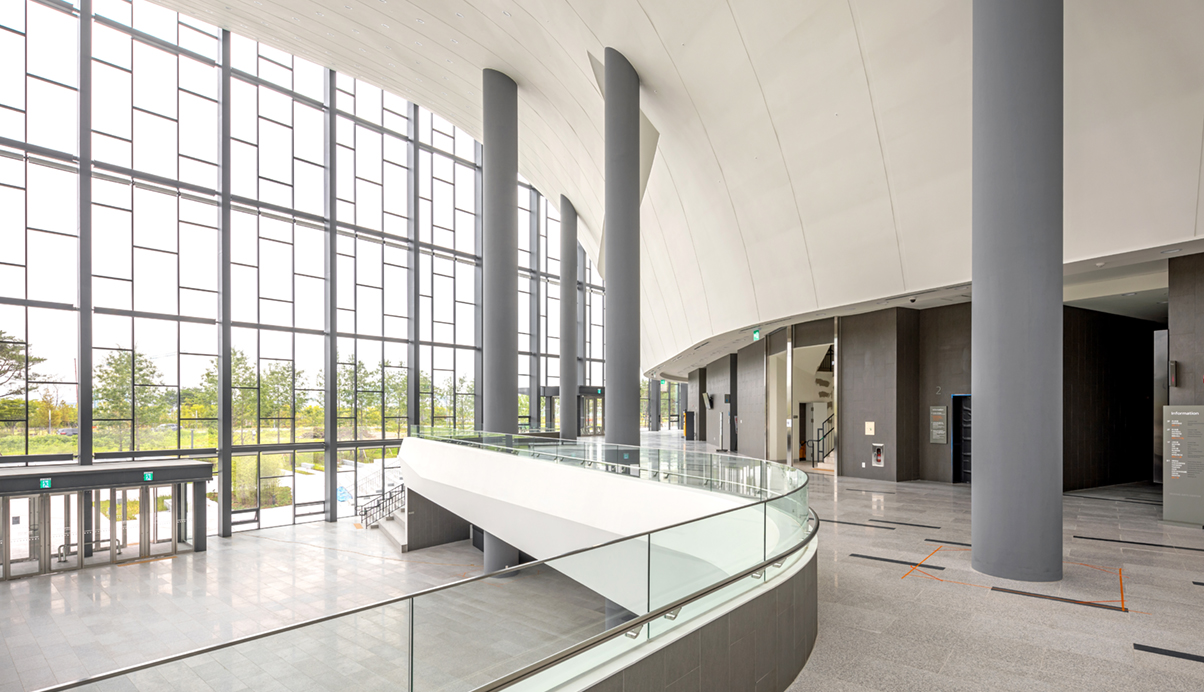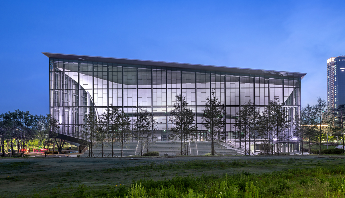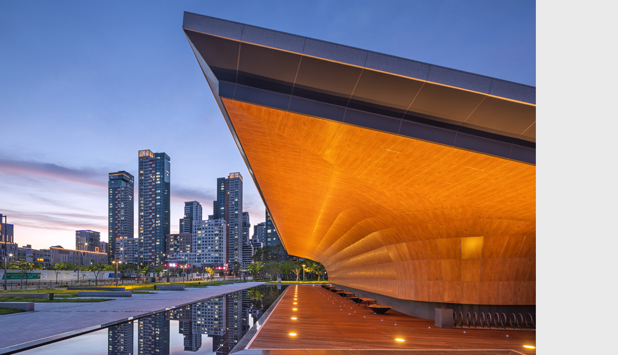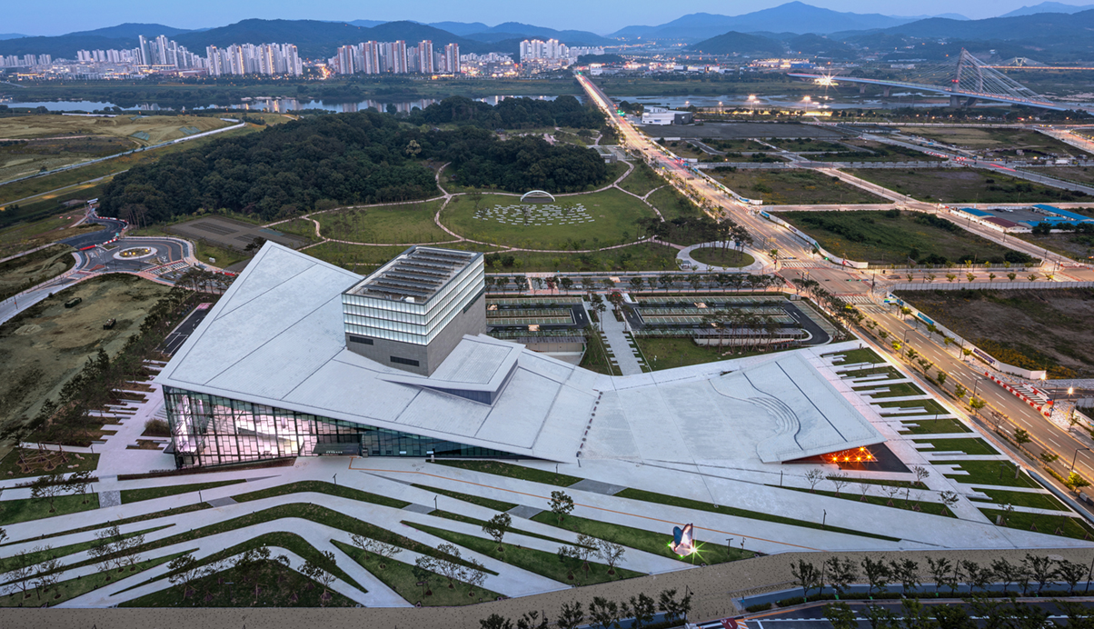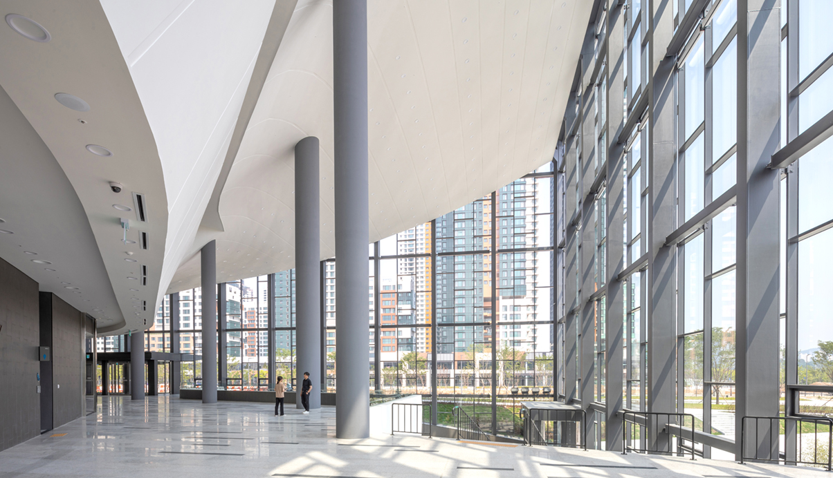 인 중앙녹지를 바라보는 동측으로는 대극장을 배치하여 공연장의 창으로 표현하여 공연장의 프로시니움 처럼
