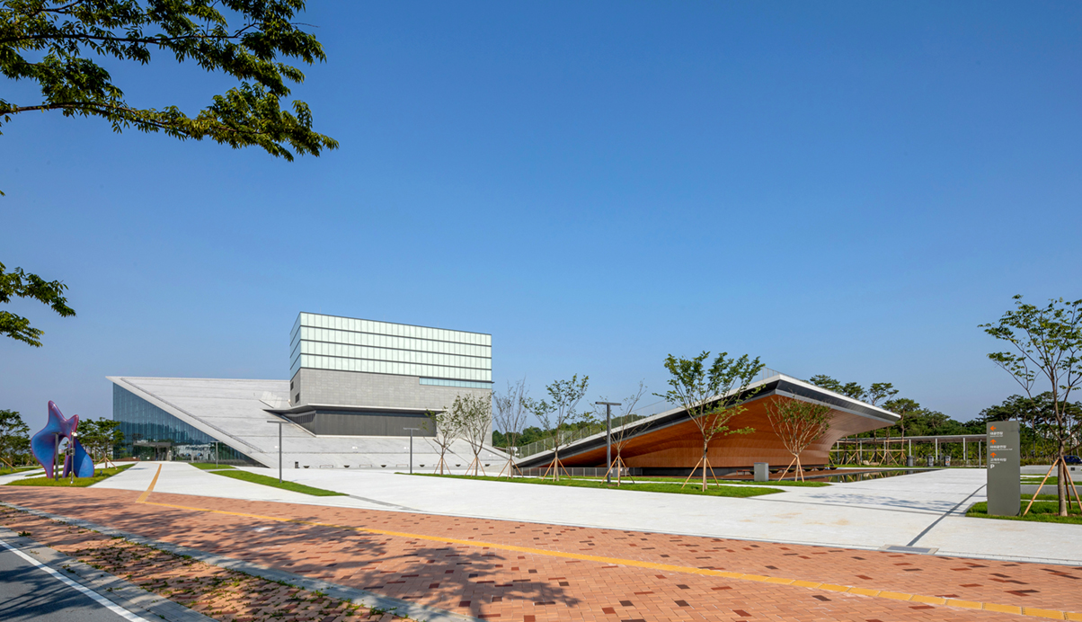 가장 감동적이고 웅장한 도시적 스케일의 뷰를 선사하여 드라마틱한 배치를 선택하였다. 두 개의 비상하는 지붕사이의 광장은 하늘을 담으면서 인근 동락정역사공원과 중앙상징광장을 연결하는 문화벨트가 이어진다. 북측 중앙상징광장의 가로광장의 대응하는 직선의 선형을 유지하고, 남측은 문화, 녹지-벨트의 흐름이 끝나는 동락정 역사공원과 대화하기 위한 포옹하는 듯 곡선을 하여 시민들을 아트센터로 안내하는 직성의 도시선형과 녹지를 향산 시민들의 감성에 부응하는 자연의 곡선형상이 공존하는 조형을 만나게 된다. 건축적인 조형 어휘는 대극장 포이어 댄싱클라우드의 유려한 곡선으로 이어지고, 이 흐름은 대극장 내부의 벽체와 천장까지 전이되어 아름다운 곡선으로 가득한 음악과 문화에너지를 느끼게 하는 공간이 연속된다.