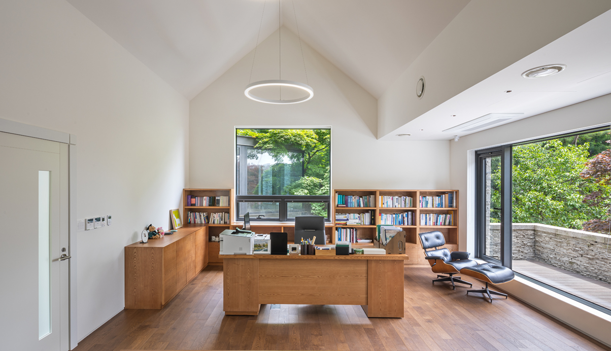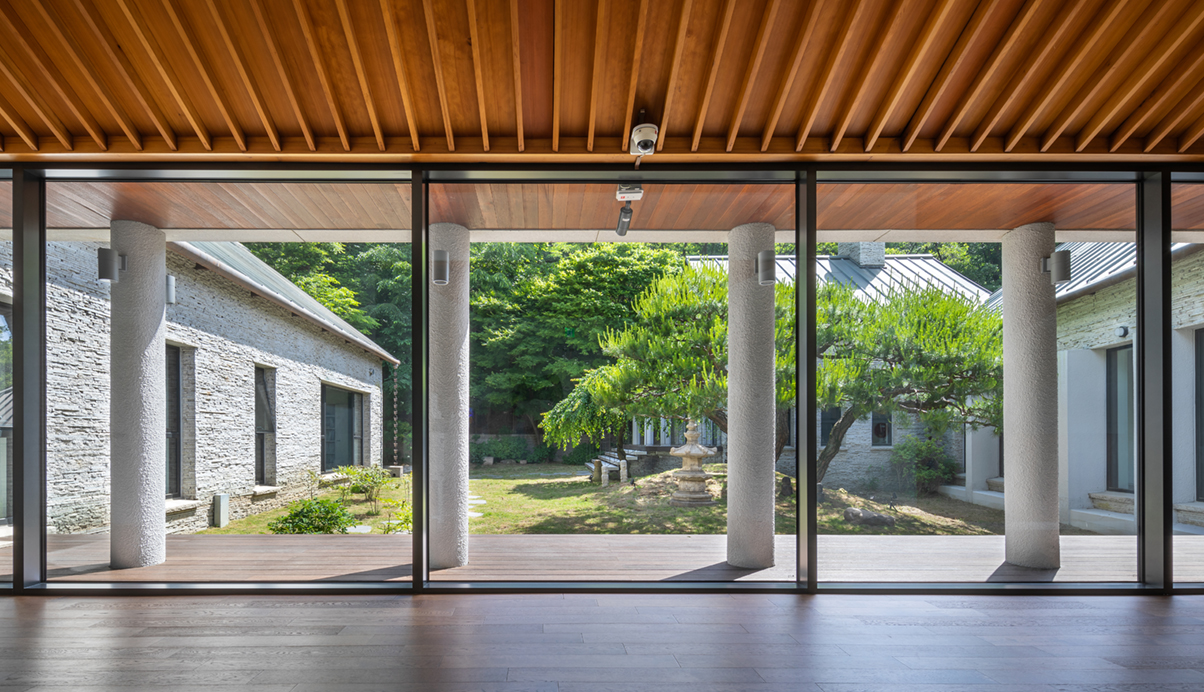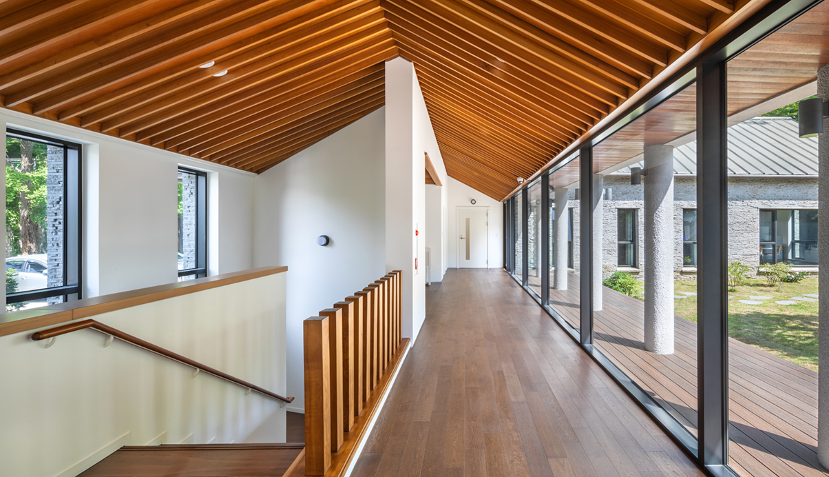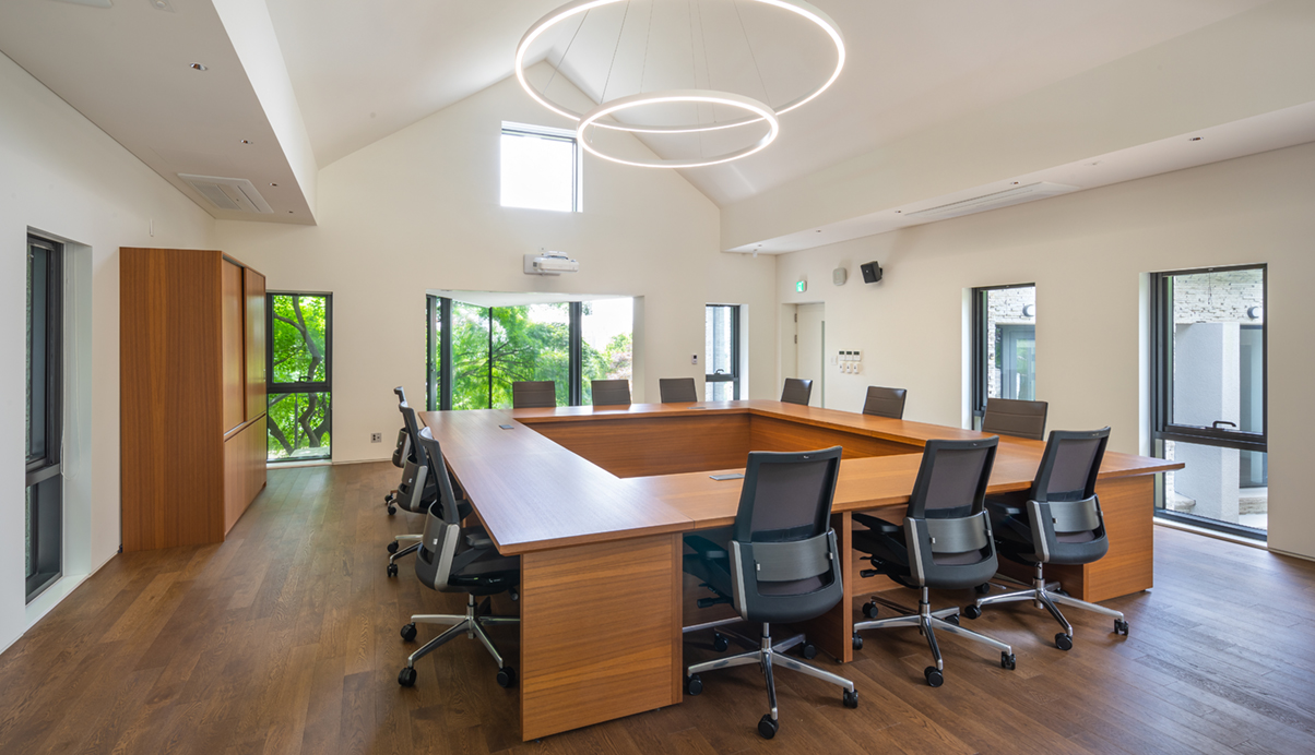 또한, 건물 전체에 반영되어 있던 격자형식의 창호프레임을 최대한 통창으로 계획하여 기존과 다른 분위기의 시각적인 개방감을 확보하였다. 법인행정동이 가지고 있던 분위기를 최대한 유지하며 진행된 리모델링을 통해 사용자 및 방문자들에게 더욱 편안하고 아늑한 공간으로 기억되길 기대해 본다.